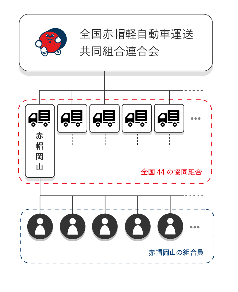 赤帽は中小企業等協同組合法に規定されている「事業協同組合」。 農家が集まって組織した「農業協同組合(農協)」や、漁師が集まって組織した漁業協同組合(漁協)と同様の組織で、貨物軽自動車運送事業者である赤帽組合員が集まって組織化されたものです。